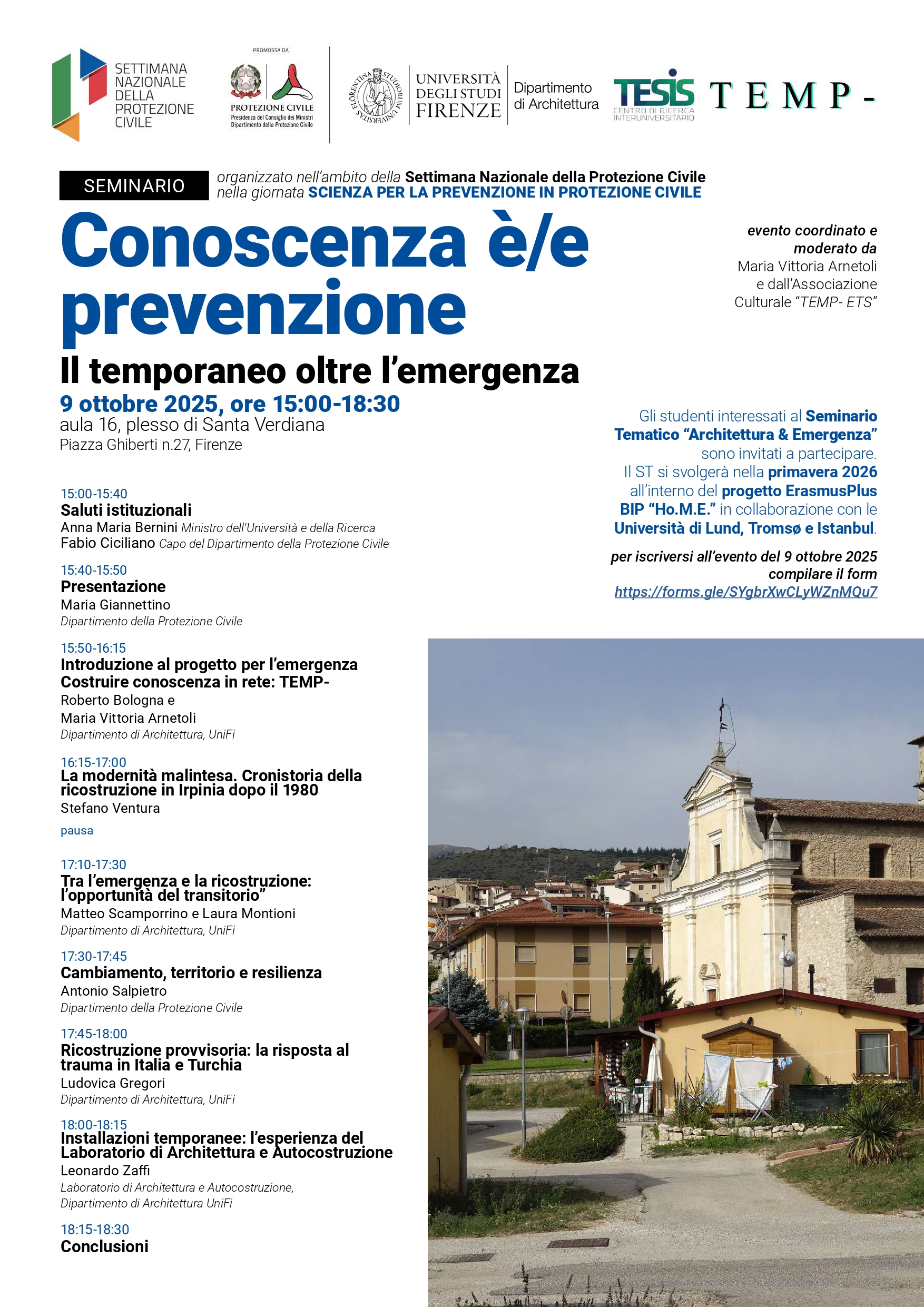 "Conoscenza è/e prevenzione. Il temporaneo oltre l’emergenza" è l’iniziativa organizzata dal Dipartimento di Architettura dell’Università degli Studi di Firenze e dall’Associazione Culturale “TEMP- ETS”, con la collaborazione del Centro TESIS, nell’ambito della giornata "Scienza per la Prevenzione in Protezione Civile" nella Settimana Nazionale della Protezione Civile. Il seminario si svolge in data 9 ottobre 2025 dalle ore 15:00 alle 18:30 presso il plesso universitario di Santa Verdiana, Piazza Ghiberti, 27, Firenze. Il seminario intende stimolare il dialogo tra istituzioni, ricerca e comunità sui temi della prevenzione dei rischi naturali, della gestione delle emergenze e delle progettualità post-disastro. In particolare il tema della temporaneità abitativa post-emergenza è affrontato nell'ambito delle discipline progettuali come paradigma della contemporanea condizione di precarietà e incertezza che caratterizza l'abitare in contesti a rischio e di crisi, fino ad esplorare gli interventi transitori come ambito di sperimentazione. Attraverso una pluralità di prospettive che con un approccio interscalare mettono in relazione le scelte pianificatorie e progettuali con il recupero psicologico e la ricostruzione fisica e sociale delle comunità, il temporaneo è infine investigato come dispositivo spaziale capace di provocare trasformazioni di uso e dunque accelerare avanzamenti nelle processualità che orientano le modalità di riduzione del rischio e gestione del disastro. Conoscenza e prevenzione non sono concetti paralleli ma inscindibili: la prima alimenta la seconda, orientandone i tempi e trasformando la memoria degli eventi passati in strumenti per affrontare con responsabilità e lungimiranza le sfide del futuro. Sono previsti interventi di docenti e ricercatori del Dipartimento di Architettura dell’Università degli Studi di Firenze e di Stefano Ventura, storico esperto del terremoto dell'Irpinia del 1980. Il seminario è aperto a tutti gli studenti e i cittadini interessati. |